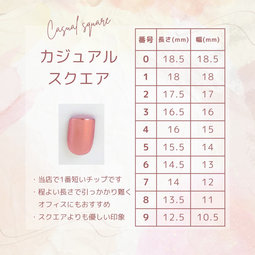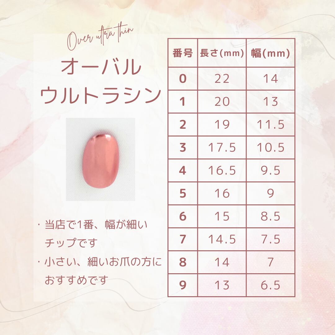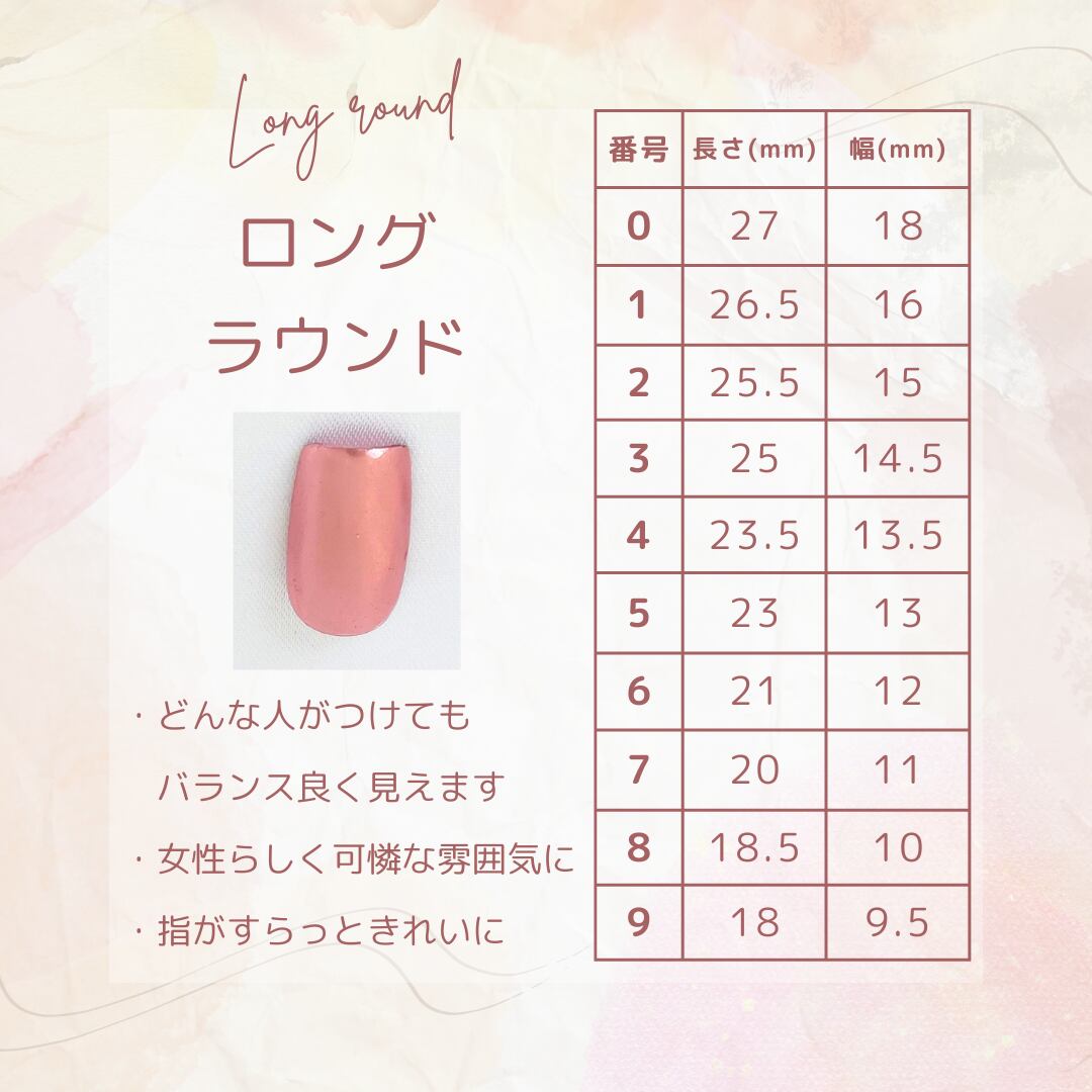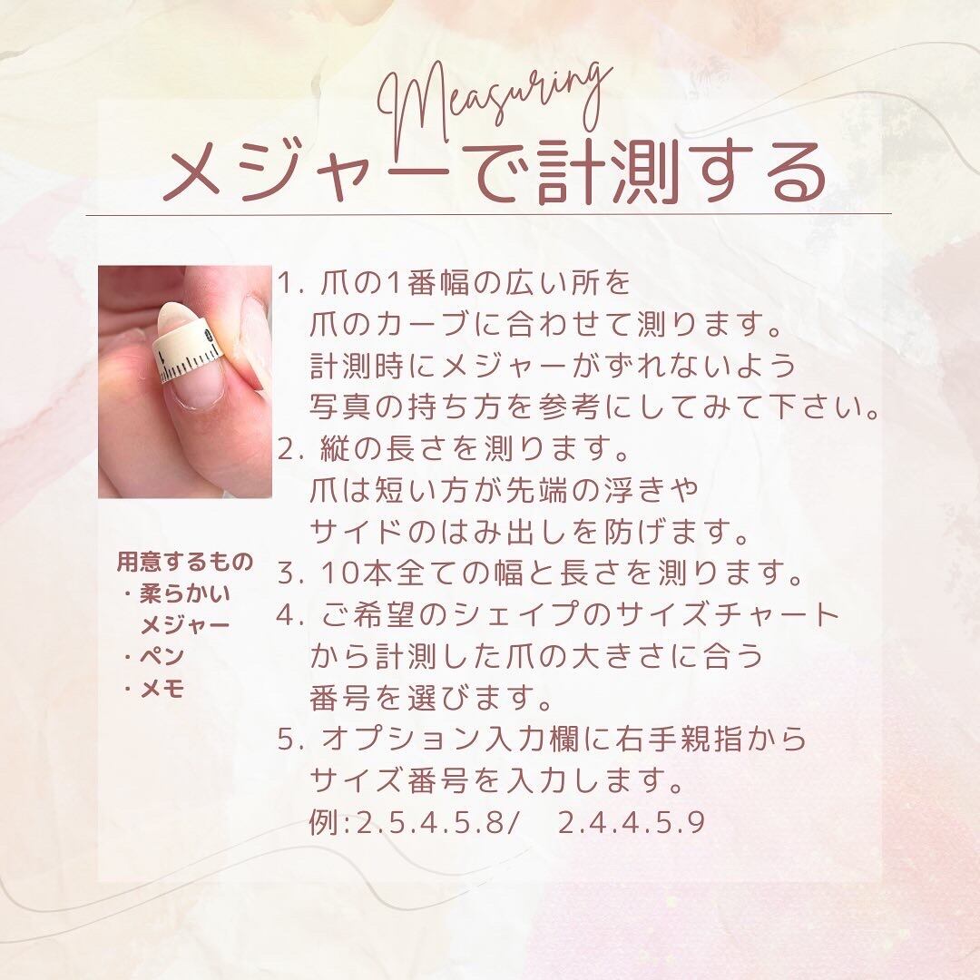 2.各シェイプの写真内サイズチャートからご自身の爪 に合うサイズ番号をチェックします。
