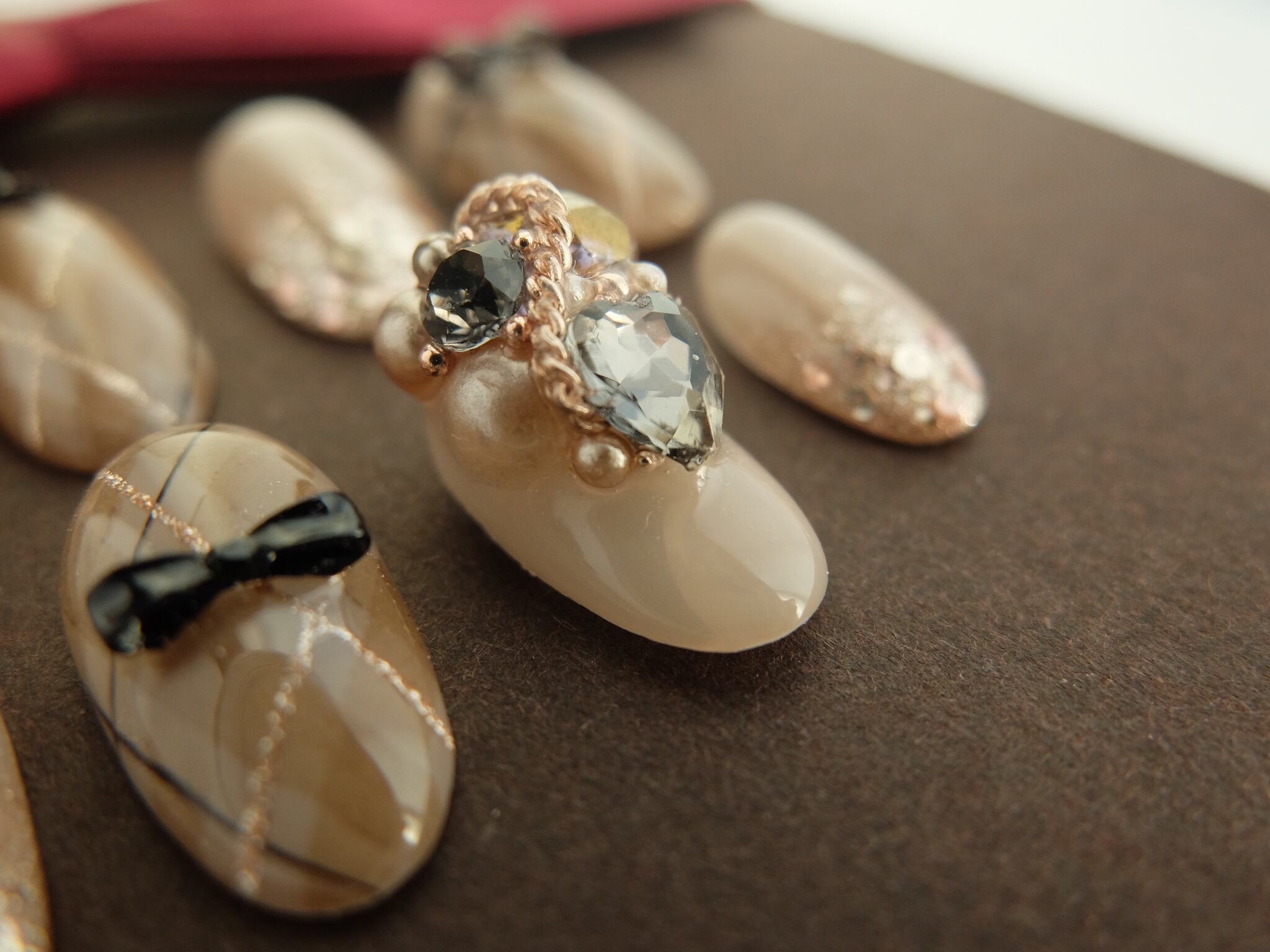 肌なじみの良いヌードベージュをベースに、今季人気のチェック柄やラメグラデーション、大人なブラックのオリジナル3Dリボンパーツとどの角度からみても美しくなるように設計したビジューが上品にきらりと輝きます。程よいボリューム感あるデザインで、指先が一気に華やぎ、手元から自信と洗練された大人の可愛らしさを叶えます!